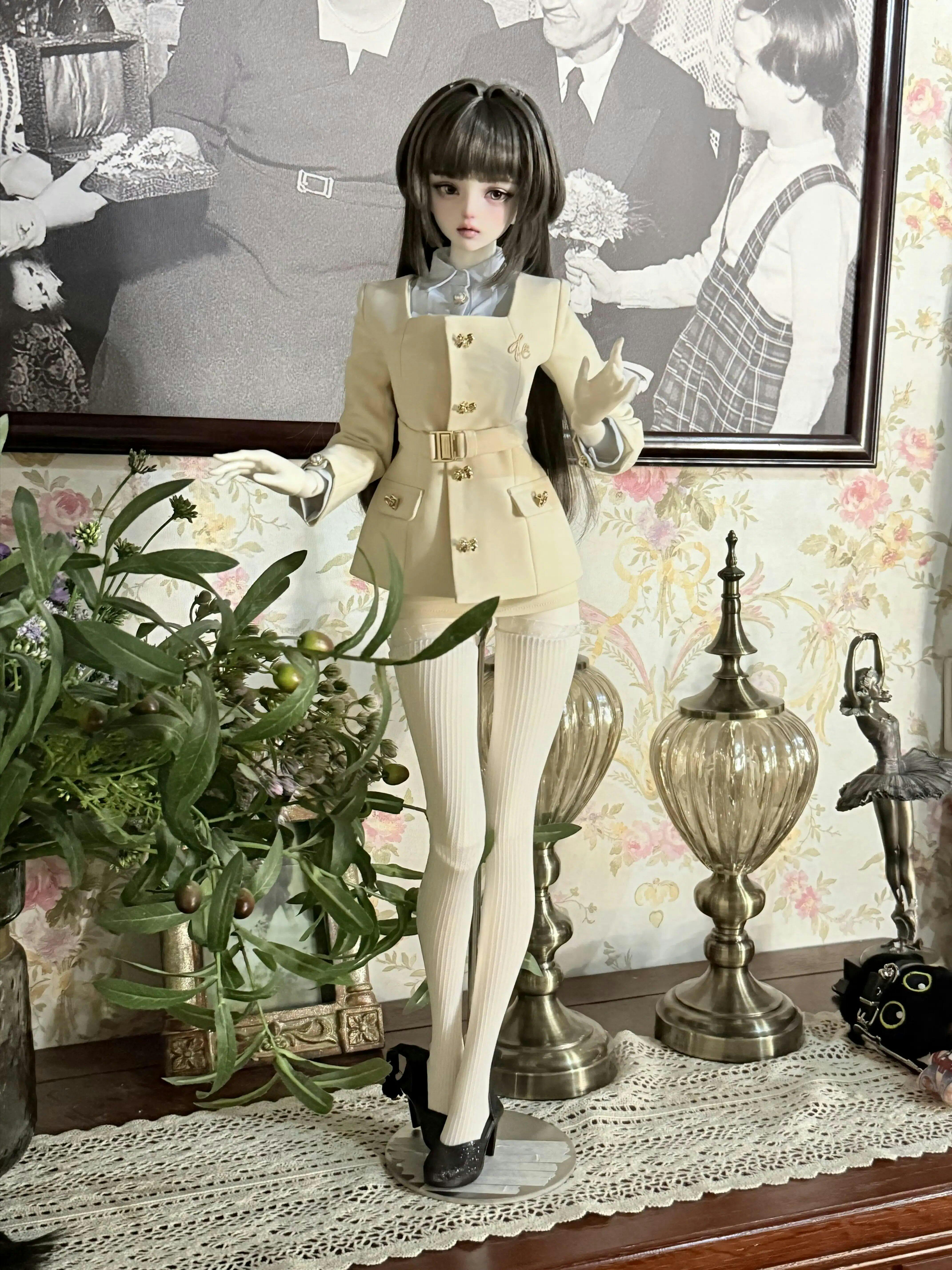 This beige suit is really eye-catching!The tailoring is neat and exquisite, and the metal buttons and belt design are full of high-end sense.The fabric has a delicate texture, soft and elegant tones, and is matched with white tights and small black shoes, which are retro and fashionable.The details are handled very well, and the overall temperament is pure and capable. It is highly recommended to start!